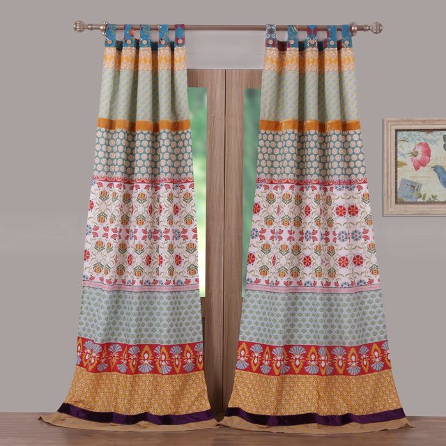 Rows of vivid geometric, foulard and floral prints create distinctive bohemian styling. The Thalia panel set features the latest fashion colors and multi-fabric construction embellished with velvet bands. This multi-fabric construction panel pair is perfect for any window. 95% Cotton, 5% polyester face, 100% cotton back (2 ply). Tab tops for up to 3" rod for hanging. Dimensions: Approx. 84" long x 42" wide each panel, including 3" tab top. Machine washable. This 4-Piece set includes two panels and two tie backs. Button embellishments on tabs add charm and character.